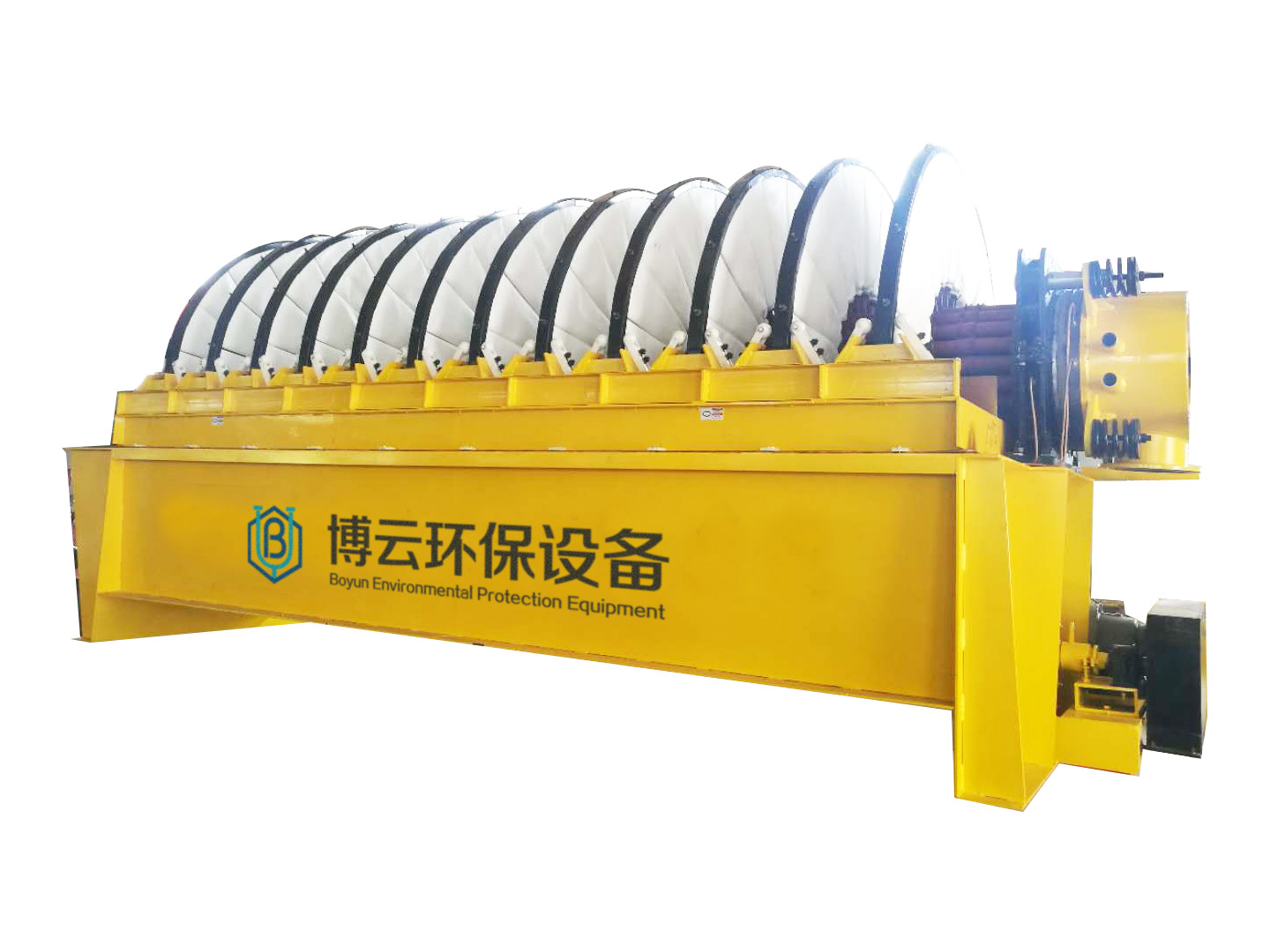 盤式真空過濾機由各個單獨的扇形片的圓盤構成。每一個扇形片為 單獨的過濾單元,由濾布做成布套在扇形片上形成濾室。過濾盤由電機通過減速器及開式齒輪傳動來驅動 ,過濾盤順時針方向轉動,濾室里的礦漿在吸附區借助于真空泵在過濾介質兩側形成的壓力差,附著在過 濾盤上形成濾餅后,攪拌器旋轉防止固體沉淀,濾餅離開液面后,在真空作用下繼續脫去水分。濾液透過 濾布,經過濾液管,從分配頭排出。濾餅在卸料區由反吹風卸料落入排料槽,整個作業過程連續循環進行 。